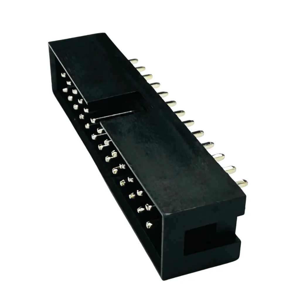2.54mm DIP box header connector is a vertical 180° through-hole header designed for high-reliability board-to-board and wire-to-board signal interfaces. This 2.54mm DIP box header connector uses a dual-row configuration with contact spacing of 2.54mm (.100″) between pins and rows, supporting standard pin counts from 6 up to 64 positions. The boxed shroud and polarizing slots ensure correct mating with matching ribbon cable or socket connectors, helping prevent misalignment in dense PCB layouts.