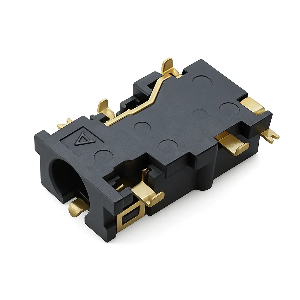 3.5mm Audio Jack – Pro-Grade Right-Angle SMT, Edge-Mount for board-edge mounting. Integrated changeover enables jack-detect/mute; 12 VAC, 1 A, 500 VAC withstand, ≥5,000 cycles, −30~+80 °C. Robust footprint with locator slots for secure retention.