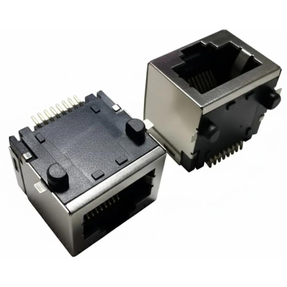 Compact RJ45 Connector, tab-up 8P8C, shielded rj45, single port, Surface mount RJ45-02ABK7AU06L-RH is a single-port right-angle connector engineered for stable Ethernet signal transmission in space-constrained PCB designs. Featuring a tab-up orientation and through-hole DIP mounting, it ensures secure mechanical retention and excellent solder joint reliability.