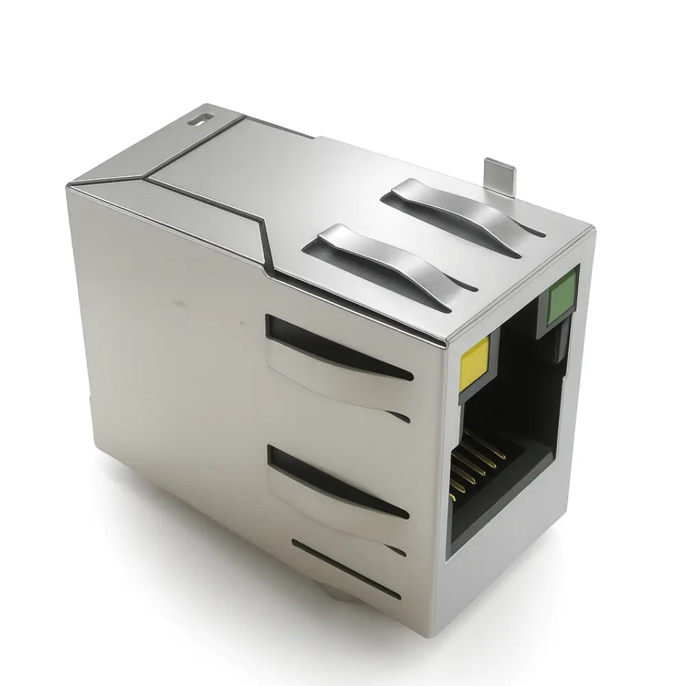 Magnetic RJ45 1×1 tab-up 10/100BASE DIP single-port RJ45 Magnetic Jack with integrated transformer circuitry for 10/100BASE-T Ethernet applications. Featuring a tab-up configuration and through-hole DIP mount, this connector includes built-in green and yellow LEDs for link and activity status.