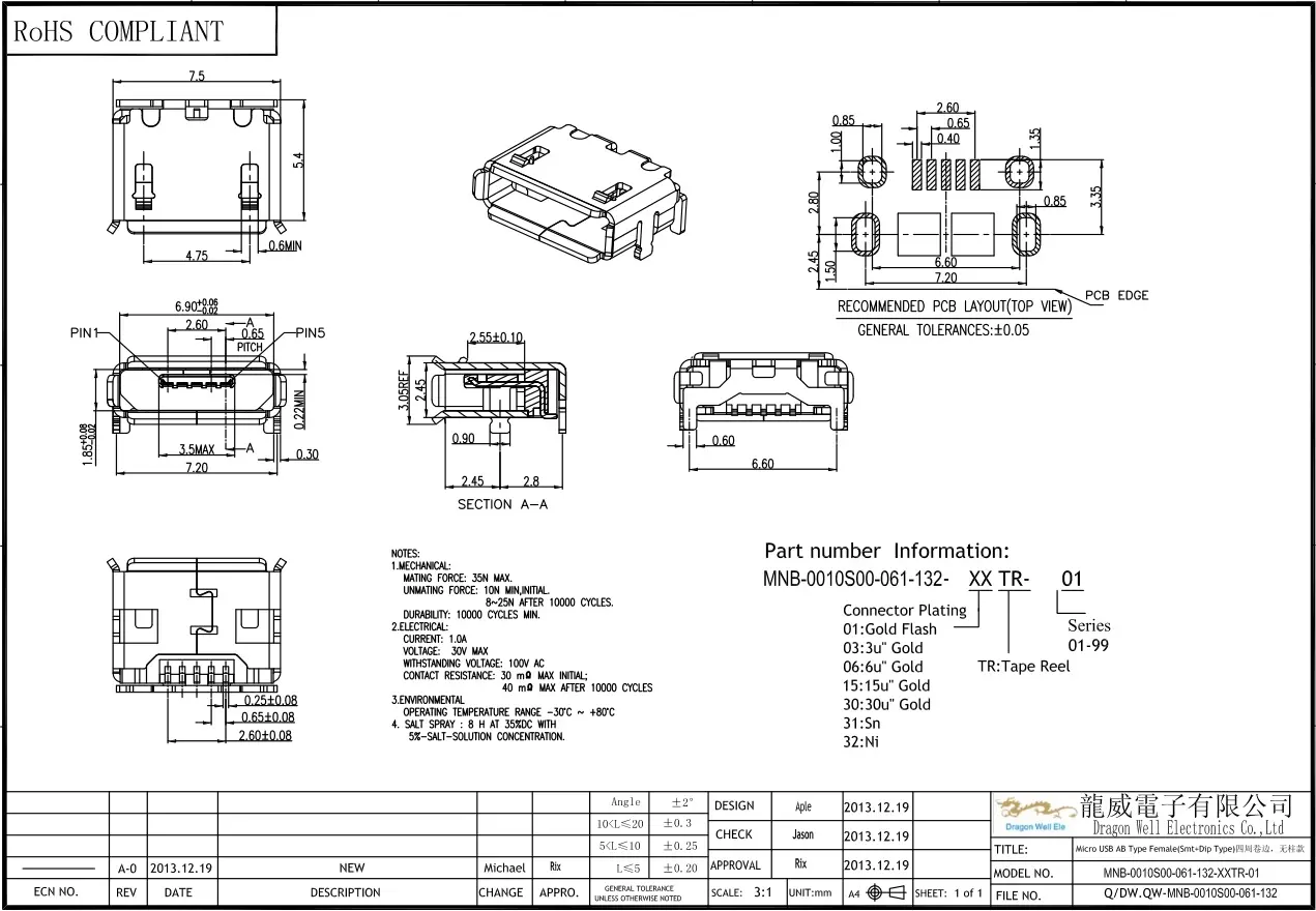 | Part number | MNB-0010S00-061-132-05TR-01 | Description | Micro USB AB Receptacle, 5PIN, SMT + DIP Type, Hybrid Mount, Height 3.05mm |
