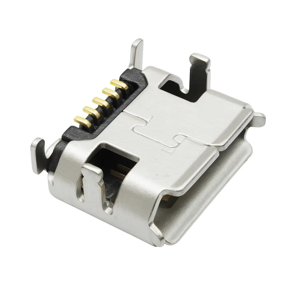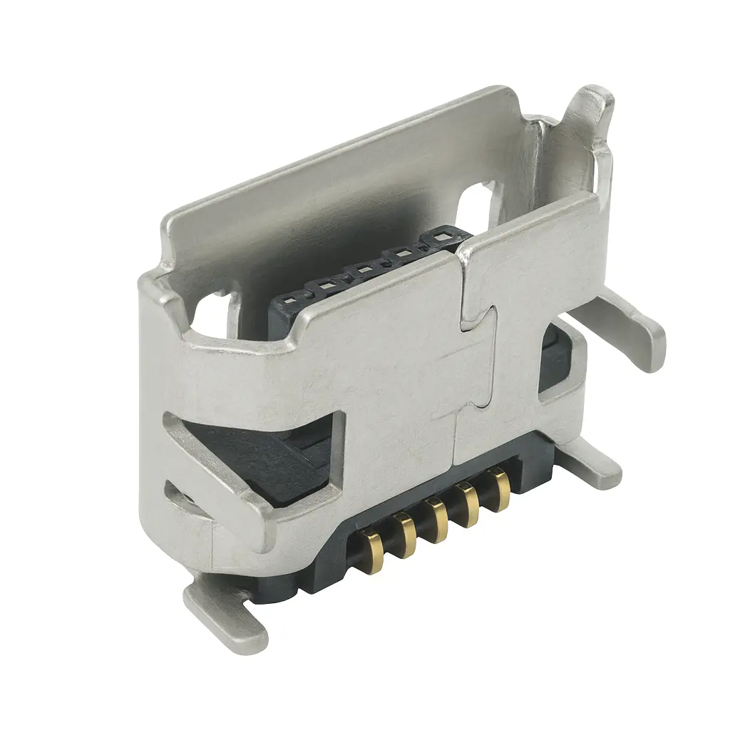 Micro USB B 5-pin female connector for compact board-edge I/O that demands strong retention and proven Micro-B interoperability. This right-angle receptacle uses a hybrid SMT + DIP structure: fine-pitch 0.65 mm surface pads carry signals while large through-hole shell stakes and ground tabs lock the connector to the PCB, resisting peel and cable loads.