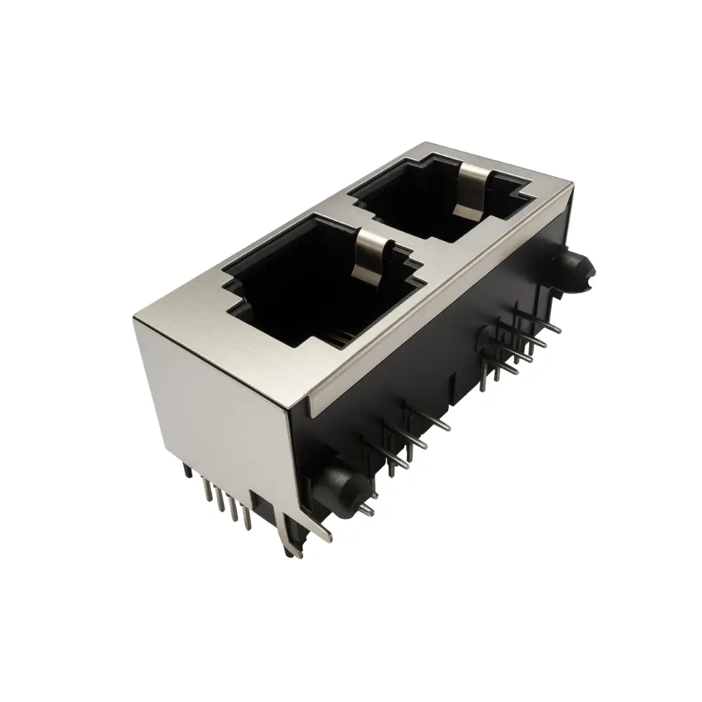 Applications: Network switches and hubs, communication devices, control panels, and routers needing compact, shielded dual-port RJ45.