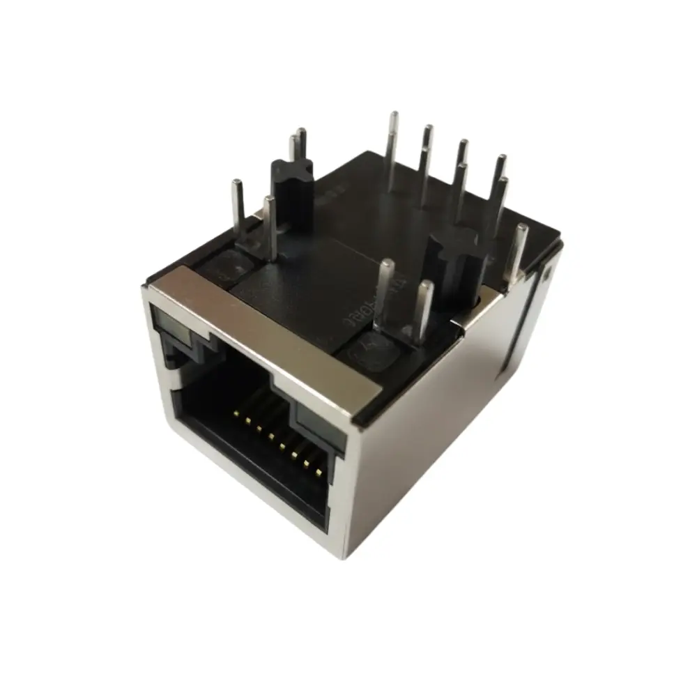 RJ45 Jack with Magnetics, 1×1 Tab-Down, 10/100BASE-T, Shielded, LED. The connector integrates isolation transformers and common-mode chokes to meet IEEE 802.3 requirements for signal integrity, EMI suppression, and PHY protection. A fully shielded metal shell improves noise immunity in dense boards, while through-hole DIP tails ensure robust retention for wave solder.