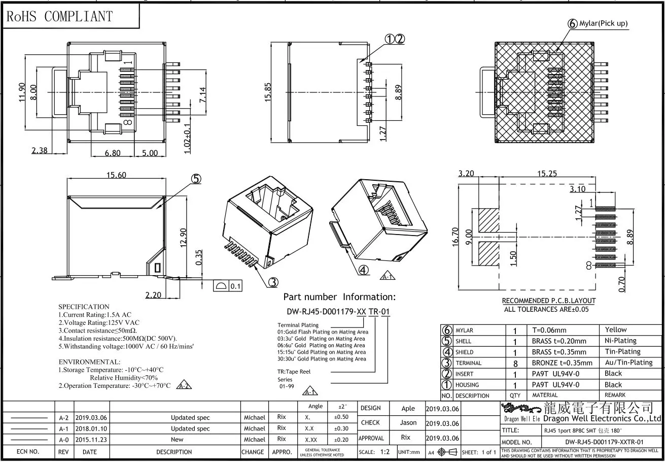 Part Number DW-RJ45-D001179-01TR-01 Description Modular Jack, Vertical, Low Profile, Shielded, Top Entry, Surface Mount, 8P8C, Tape Reel
