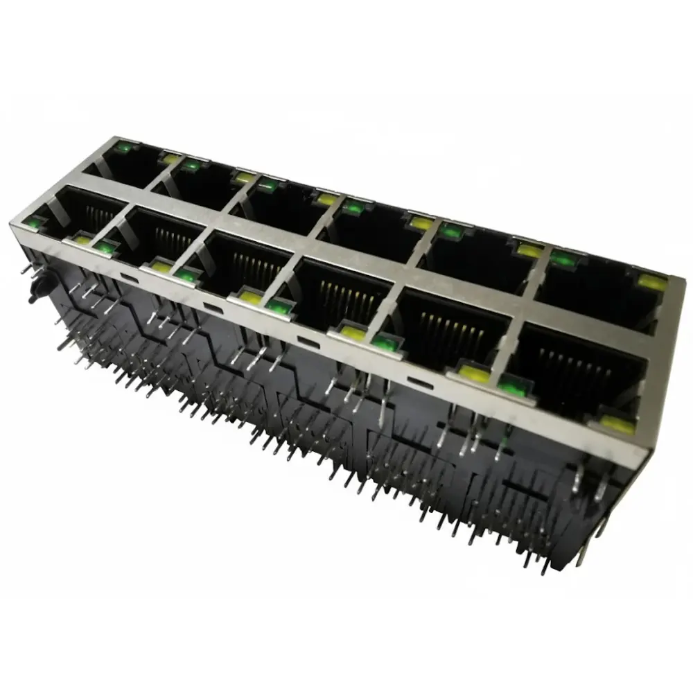 Highlights : 12-port stacked RJ45 connector with LEDs, Stainless steel shielding ensures strong EMI protection, High-temperature housing with UL94V-0 flame retardance, Multiple contact plating options to meet performance needs, Optimized for space-efficient multi-port PCB layouts