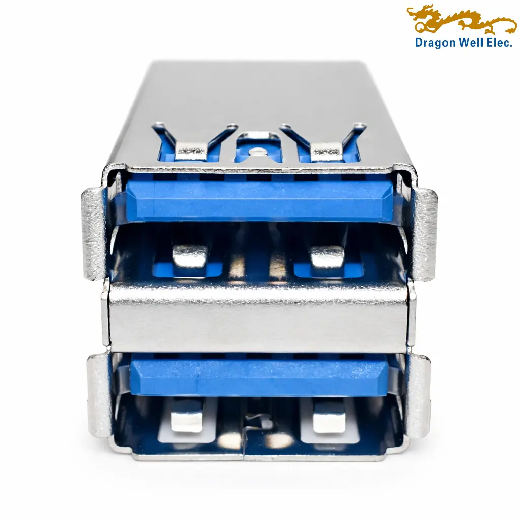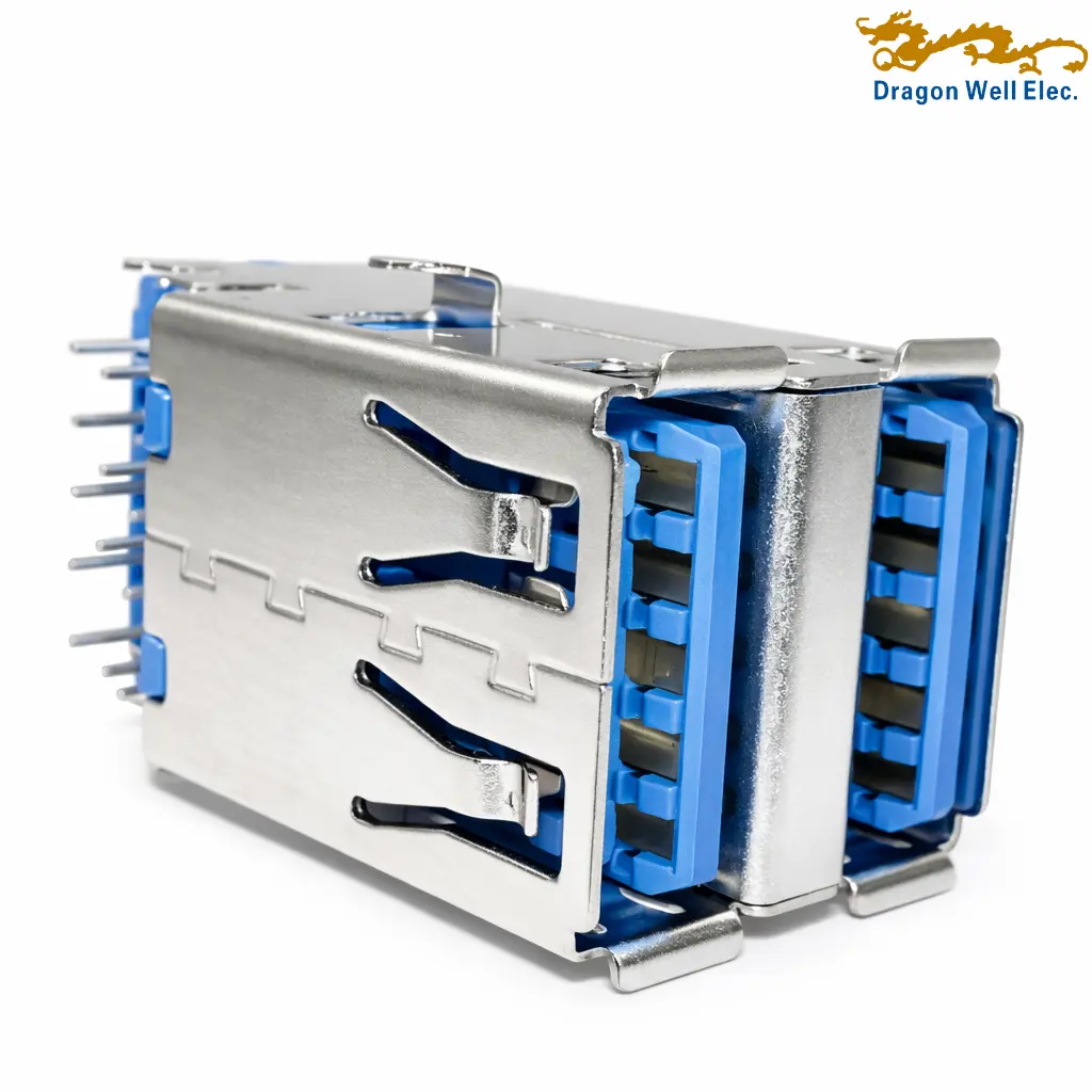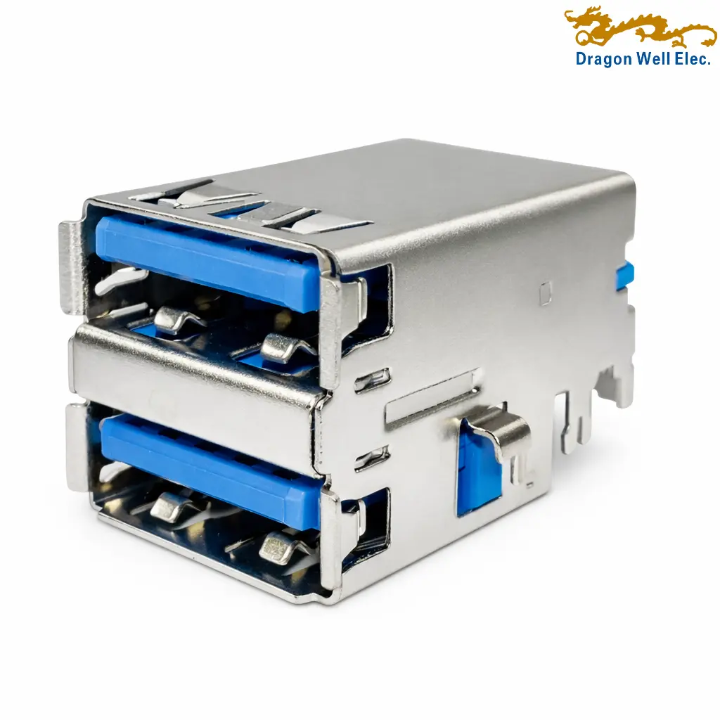 With its double deck USB Type-A structure, right-angle board mounting, and USB 3.0 blue insulator design, this stacked USB 3.0 female connector is suitable for industrial computers, embedded systems, control panels, communication devices, servers, and consumer electronics that require dual USB ports in limited PCB space.