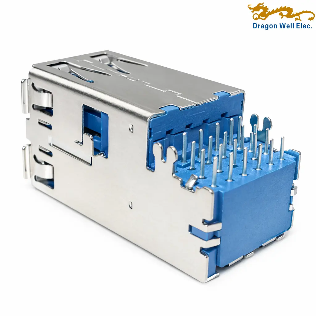 • Highlights: USB 3.0 AF double deck connector; dual stacked female ports; right-angle PCB type; 9-pin per port; H=9.91mm; blue USB 3.0 insulator; 30u” gold plating on contact area; matte tin on solder tails; nickel-plated shell; reflow solder capable to 260°C