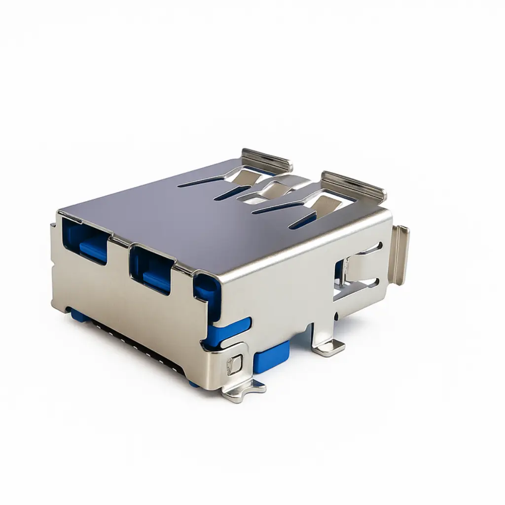 USB 3.0 Type-A dual port connector in a stacked, right-angle package that saves front-panel space while delivering SuperSpeed performance and rugged retention. The short-body housing integrates SMT signal pins with through-hole shell stakes and board locks to keep the assembly fixed during wave/reflow and repeated use.