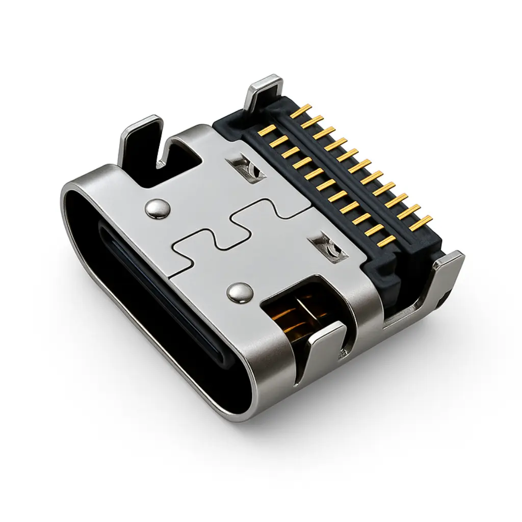 Rugged SMT + post construction resists peel and cable load while preserving signal integrity. Full Type-C pinout supports power, CC negotiation, SBU, and SuperSpeed pairs in one compact shielded jack.
