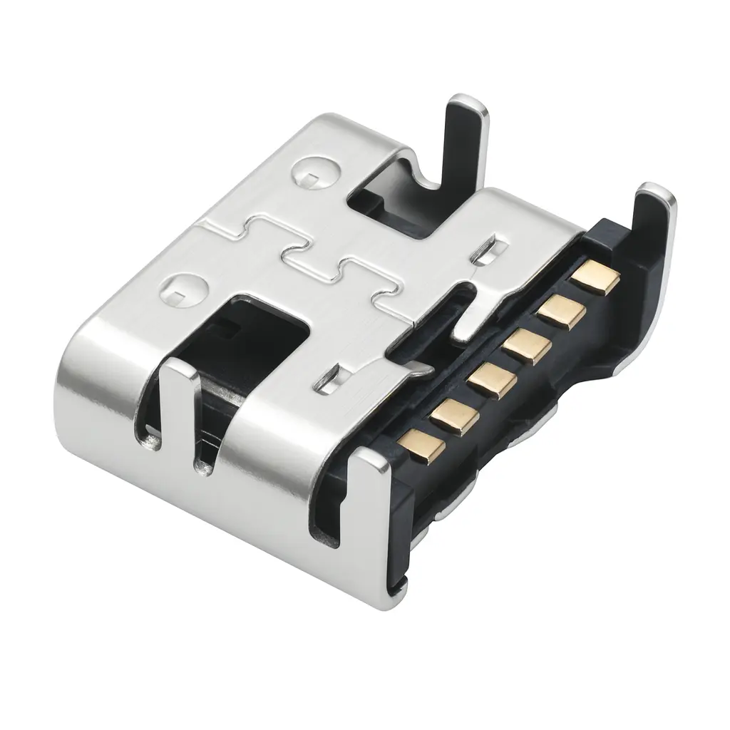 USB Type-C 6-pin female connector – Compact Right-Angle SMT for space-constrained board-edge I/O where power and basic CC signaling are required without the full 24-pin stack. This right-angle, surface-mount receptacle uses a low-profile housing with a compact footprint for reflow assembly.
